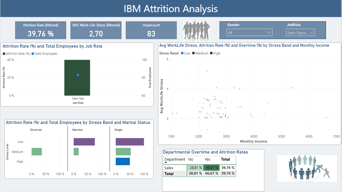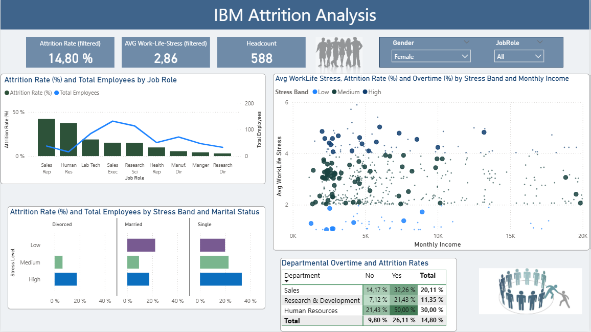 Filtering by gender alters overall attrition rates but preserves the dominant structure: overtime and work–life stress remain the primary drivers of employee exits. Overall attrition is moderately higher among male employees (~17%) than female employees (~14.8%), but role-level patterns reveal more important distinctions. Sales Representatives and Human Resources roles exhibit disproportionately high attrition relative to headcount for both genders. Among female employees, attrition within both Sales Representatives (~45%) and Human Resources (~40%) approaches, while among male employees, attrition reaches ~40% in Sales Representatives but is notably lower in Human Resources (~26%). These differences suggest that while certain roles carry elevated attrition risk across genders, the magnitude of that risk varies by gender–role combination rather than gender alone.